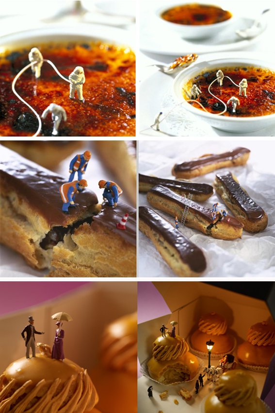 Qui a dit que l’on n’avait pas le droit de jouer avec la nourriture? Akiko Ida et Pierre Javelle ne s’en privent pas et ce n’est pas sans (me) déplaire. Les deux amoureux, tout droit sortis des Arts Décoratifs de Paris, ont créé pas moins d’une soixantaine de photographies mettant en scène de petits personnages dans de drôle de situations. Inversement de l’échelle humaine, et voici un alpiniste grimpant sur un mont blanc en dessert! A. Ida et P. Javelle s’amusent à détourner l’univers culinaire de ses mesures parfois un peu strictes (notamment les pâtisseries), pour y planter leur décor. « Qui n’a jamais rêvé de plonger dans une mousse au chocolat, creuser une caverne dans un fruit ou du fromage… ? ». N’allez pas plus loin, les minimiams l’ont fait pour nous.